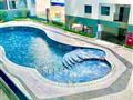 - View hồ bơi chính diện, nhìn ra trường học và đường lớn.