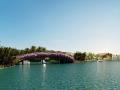 Hệ sinh thái sống xanh với hồ cảnh quan, hàng cau, mái ngói Hội An đặc trưng.