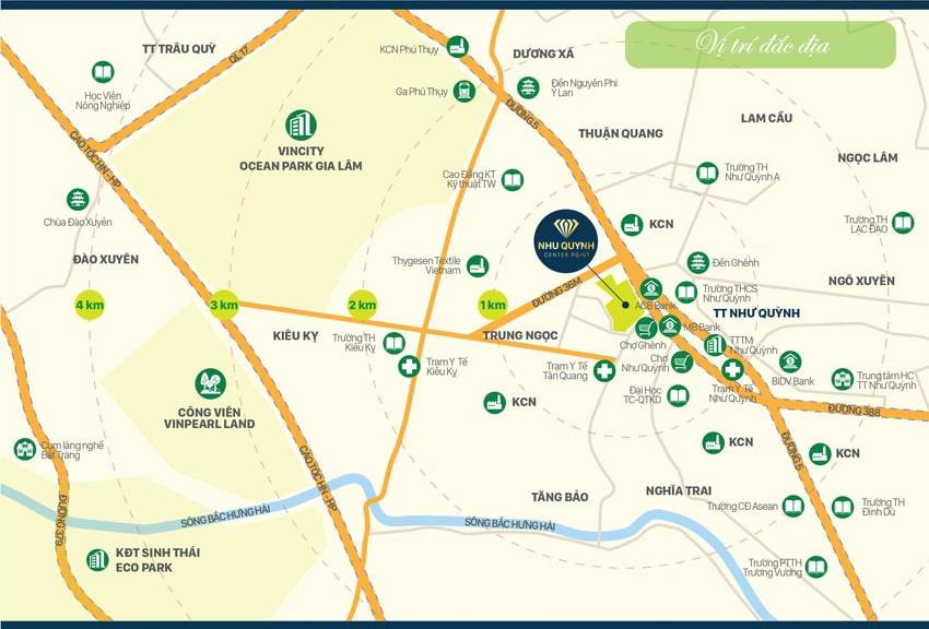 Dự án 102 Như Quỳnh nằm ngay trung tâm thị trấn Như Quỳnh, kết nối trực tiếp với QL5A và QL388 chạy liên tỉnh sang Bắc Ninh, Hải Dương, Hải Phòng,… Được thừa hưởng tiện ích trực tiếp từ dự án Vincity Ocean Park (Gia Lâm, Long Biên, Hà Nội). Bên cạnh đó khu dân cư mới cũng được được đầu tư hoàn thiện hạ tầng đồng bộ, giao thông thuận tiện kết nối nhanh chóng đến các địa điểm vui chơi, mua sắm, trường học, bệnh viện lớn,…