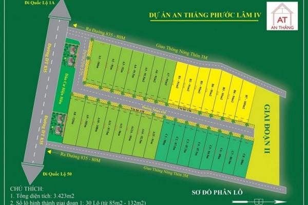 Khu dân cư An Thắng - Phước Lâm 4 do Công ty TNHH MTV BĐS An Thắng làm chủ đầu tư với quy mô 3.423m2 tại Cần Giuộc, Long An. Trong đó, giai đoạn 1 của dự án sẽ triển khai 30 sản phẩm đất nền với diện tích đa dạng, dao động từ 85m2 đến 132m2.