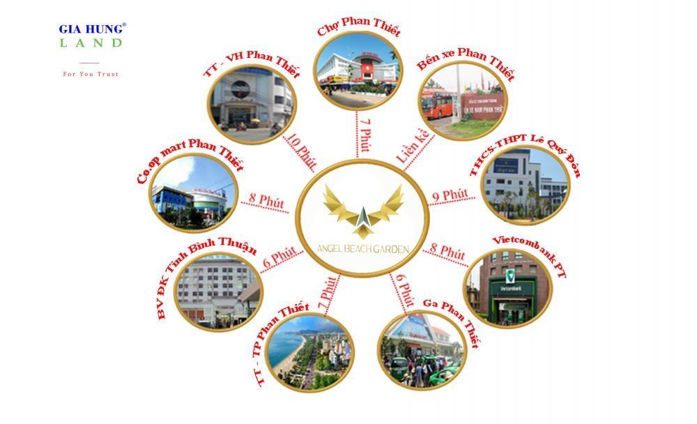 Angel Beach Garden Phan Thiết cách trung tâm TP. Phan Thiết, ga tàu Phan Thiết, bãi biển Đồi Dương, siêu thị Lotte Mart, Co.op Mart chưa đến 10 phút. Cư dân có thể dễ dàng di chuyển tới các khu vực trung tâm và thừa hưởng hệ thống tiện ích xung quanh chỉ với vài phút di chuyển như khu vui chơi giải trí, bệnh viện, trung tâm thương mại, tài chính lớn, hệ thống các trường đại học...