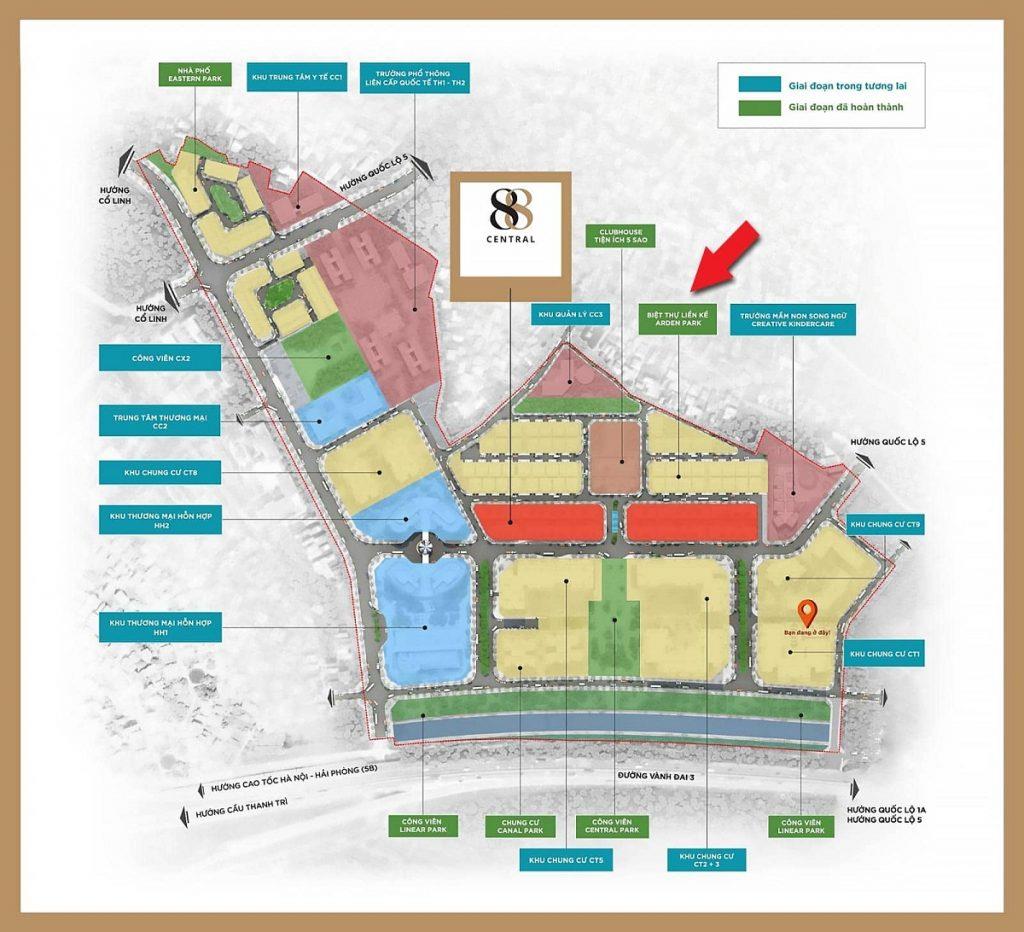 Phân khu biệt thự liền kề Arden Park nằm ở phía Bắc của khu đô thị Hanoi Garden City, giữa 2 dãy của khu là Clubhouse 5 sao Arden Club & Cabana và 3 sân tennis. Phía trước mặt hướng Đông Nam của khu biệt thự tiếp giáp với khu shophouse 88 Central với 86 căn, phía Đông Bắc tiếp giáp với trường mầm non song ngữ Creative Kindercare, phía Tây Nam tiếp giáp với khu chung cư CT8 và khu thương mại hỗn hợp HH2, phía Đông Nam tiếp giáp với khu vui chơi của trẻ con.