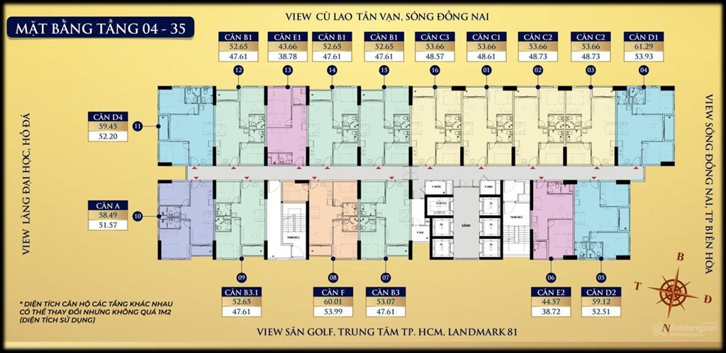 - Căn hộ 2PN loại thường: 53 – 54m2
