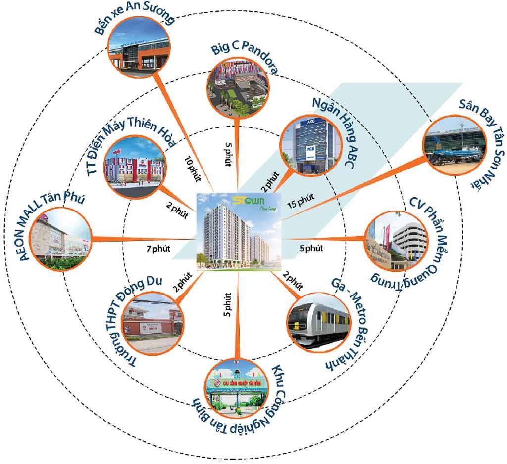 Vị trí dự án Stown Tham Lương tạo điều kiện cho cư dân di chuyển thuận lợi đến các tiện ích ngoại khu nổi bật như Aeon mall Tân Phú, Co.opmart Phan Văn Hớn, Big C Pandora, Công viên phần mềm Quang Trung, Bến xe An Sương,…