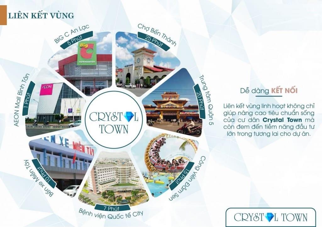 Dự án Crystal Town tọa lạc ngay mặt tiền các đường 25, 27, 29 thuộc khu dân cư Tên Lửa, Phường Bình Trị Đông B, Quận Bình Tân, TP.HCM. Với vị trí 3 mặt tiền, xung quanh là nhiều tiện ích hiện đại, công viên lớn, khu nhà phố này không chỉ thuận tiện cho cuộc sống hàng ngày mà còn sở hữu những lợi thế cần có của một dự án nhà phố thương mại. Bên cạnh đó, hệ thống giao thông khu vực cũng đang được nâng cấp, mở rộng, tạo điều kiện cho di chuyển, lưu thông hàng hóa.
