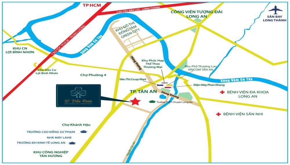 Khu đô thị D’ Villa Centa nằm trên đường Võ Văn Môn, phường 4, TP. Tân An, tỉnh Long An. Dự án chỉ cách trung tâm TP. Tân An khoảng 5 phút di chuyển và vị trí của KĐT này cũng rất thuận lợi cho cư dân trong việc kết nối đến các khu vực lân ận khi nằm ngay bên cạnh các tuyến đường huyết mạch: Cao Tốc Bến Lức - Long Thành, Cao Tốc Trung Lương - Tp.HCM, Cao Tốc Trung Lương - Cần Thơ...