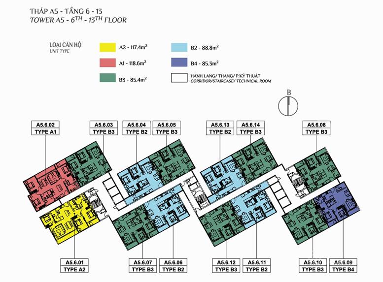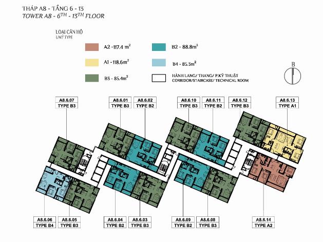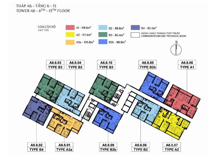 Thiết kế tháp A6: Cao 13 tầng, tổng 88 căn hộ gồm 63 căn 02 phòng ngủ, 25 căn 03 phòng ngủ.