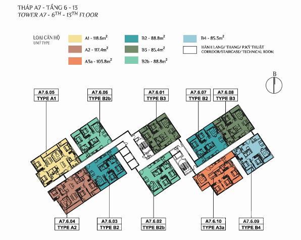 Thiết kế tháp A7: Cao 13 tầng, tổng 88 căn hộ gồm 63 căn 02 phòng ngủ, 25 căn 03 phòng ngủ.