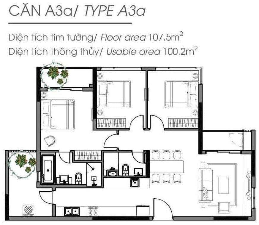 - Diện tích: 107.5m2 - Giá bán căn hộ: 5,2 tỷ – 5,4 tỷ