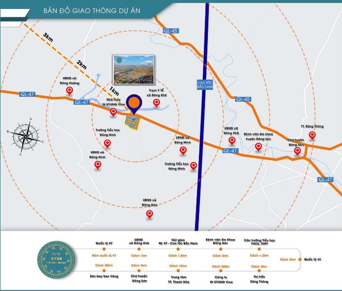 QL47 là tuyến đường kết nối thành phố Thanh Hóa với sân bay quốc tế Sao Vàng Thọ Xuân. Dự án Đô thị 3739 Đông Ninh Đông Khê nằm ngay cổng chào xã Đông Ninh, là điểm giao nhau giữa hai tuyến đường liên xã và QL47.