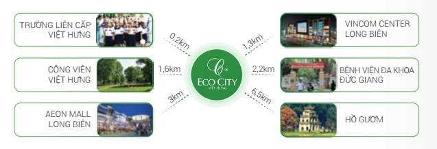 Chung cư Eco - City Việt Hưng được thừa hưởng tất cả các tiện ích khu vực hiện đại có sẵn như trung tâm thương mại AEON Mall, Vincom, bệnh viện đa khoa Đức Giang, khu vui chơi giải trí, công viên Việt Hưng,... Đáp ứng mọi nhu cầu cho cư dân.