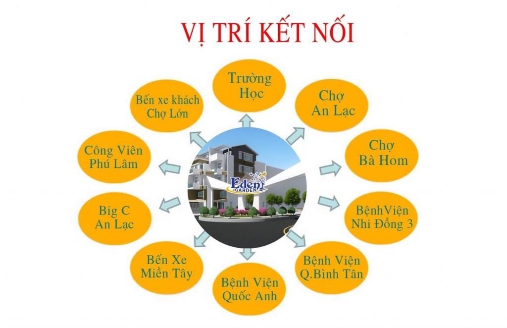 Khu dân cư Eden Garden sở hữu kết nối thuận lợi với các tuyến đường trọng điểm của khu vực như tỉnh lộ 10 (Bà Hom), đường Trần Văn Giàu, Đường số 7 KDC Tên Lửa, Đường dẫn cao tốc Tân Tạo Chợ Đệm... nên dễ dàng di chuyển đến các khu vực xung quanh và khu trung tâm thành phố cũng như các tiện ích kề bên.
