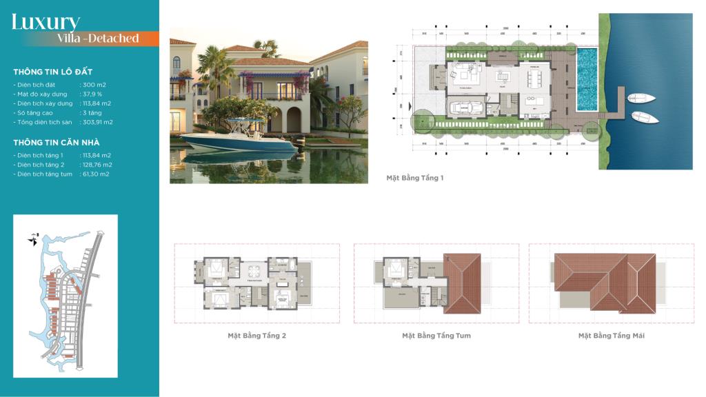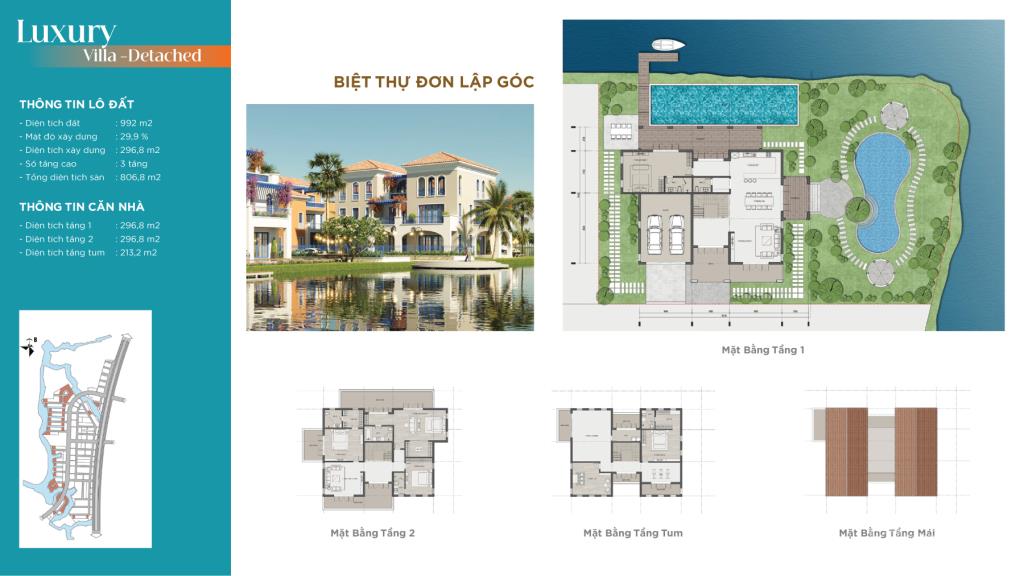 - Biệt thự đơn lập góc: Từ 992m2, gồm 3 tầng.