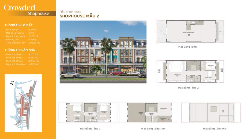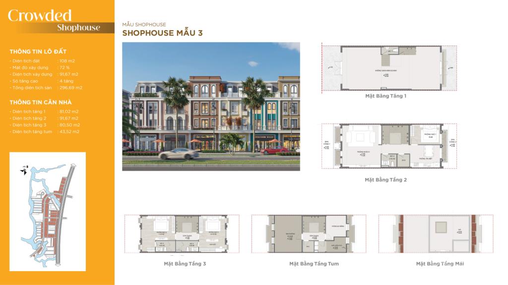 - Nhà phố thương mại (Shophouse): Từ 108m2 - 290m2, gồm 3 tầng 1 tum.