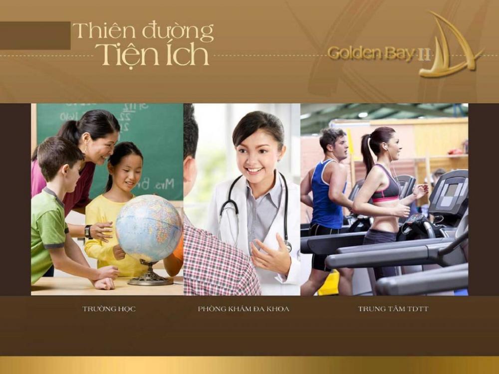 Bên cạnh đó, khi an cư tại Golden Bay 2, bạn và gia đình sẽ được tận hưởng những phút giây thư giãn, nghỉ ngơi thoải mái sau những bộn bề của cuộc sống thường nhật với đầy đủ tiện ích nội khu sẵn có như trung tâm thương mại, nhà hàng, khu du lịch thể thao, bệnh viện, trường học, sân tennis, công viên cây xanh, hồ cảnh quan phục vụ mọi nhu cầu của từ ăn uống, vui chơi giải trí, học tập…