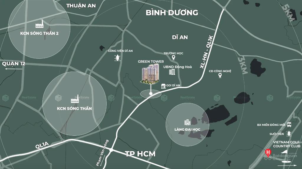 Dự án Green Tower Dĩ An của TBS nằm trong Khu phức hợp Green Square tọa lạc ngay ngã 3 Đường Quốc Lộ 1K & Đường GS1, phường Đông Hòa, thành phố Dĩ An, tỉnh Bình Dương. Đây là một khu đô thị quy mô lớn được quy hoạch thành khu thương mại - trung tâm hành chính huyện Dĩ An. Dự án Green Tower Dĩ An có quy mô 1.32 ha và mật độ xây dựng là 38%.