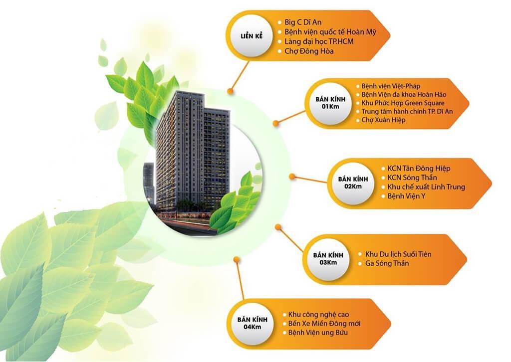 Ngoài ra, từ dự án Green Tower Dĩ An, cư dân dễ dàng kết nối với các tiện ích ngoại khu khác từ khu vực: Siêu thị BigC, bệnh viện (Hoàn Mỹ, Việt Pháp, Hoàn Hảo), Làng Đại Học, chợ (Đông Hòa, Xuân Hiệp), Trung tâm hành chính, KCN (Tân Đông Hiệp, Sóng Thần, KCX Linh Trung)….