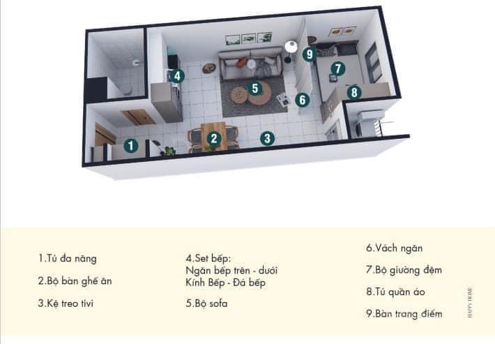 Các căn hộ Happy Home Dĩ An Bình Dương có diện tích đa dạng, linh hoạt, phù hợp với nhu cầu của cư dân: