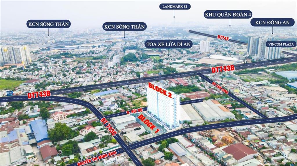 Vị trí dự án Happy Home Dĩ An nằm ngay mặt tiền đường 743C, thuộc phường Tân Đông Hiệp, TP. Dĩ An, tỉnh Bình Dương. Dự án nhà ở xã hội này tọa lạc tại khu vực giáp ranh giữa ba vùng kinh tế trọng điểm phía Nam là TP.HCM, Bình Dương và Đồng Nai. Thêm vào đó, dự án Happy Home cũng gần các tuyến giao thông huyết mạch như Quốc lộ 13, Quốc lộ 1A, Xa lộ Hà Nội cũng như tuyến Metro số 1 Bến Thành – Suối Tiên.