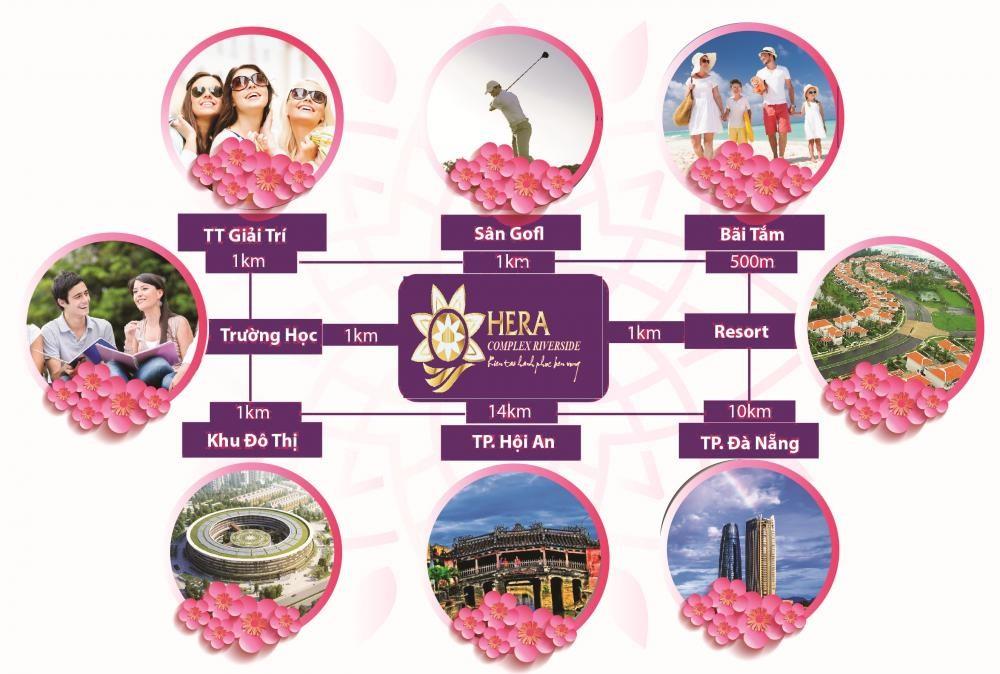 Hera Complex Riverside nằm trên địa bàn phường Điện Ngọc, Điện Bàn, tỉnh Quảng Nam, ngay con đường biển 5* Đà Nẵng - Hội An, được bao quanh bởi các dự án: Ocean Villas, The Empire, The Nam Hải Resort, Khu Nghĩ dưỡng cao cấp CTX Holding, Resort Sông Hàn và 2 sân golf đẳng cấp Châu Á.