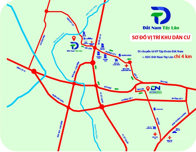 Dự án KDC Đất Nam Tây Lân nằm trên trục đường 111 Tây Lân (dự phóng 25m) và 131 Tân Lân (hoàn thiện 20m), thuộc địa bàn 2 phường Bình Trị Đông A và phường Tân Tạo, quận Bình Tân, TP.HCM.