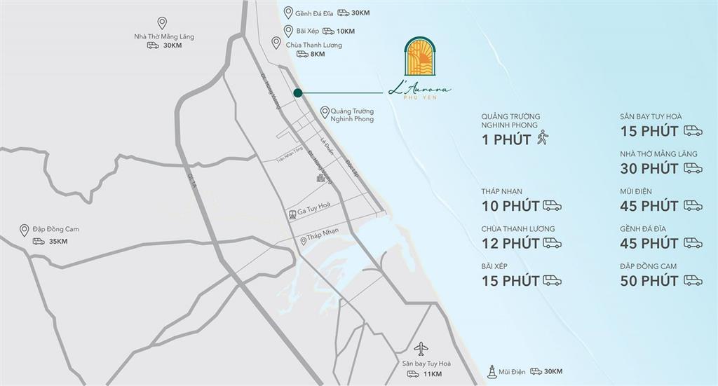 L’Aurora Phú Yên nằm trên đường Độc Lập chạy dọc theo bờ biển, được coi con đường đắt giá nhất thành phố Tuy Hòa. Ngoài ra, dự án cũng tiếp giáp với 3 trục đường quan trọng khác là đường Lê Duẩn, Trần Nhân Tông, Võ Trứ. Từ dự án, cư dân và du khách có thể nhanh chóng tiếp cận các tiện ích trong thành phố cũng như di chuyển đến các điểm du lịch, giải trí nổi tiếng của Phú Yên.