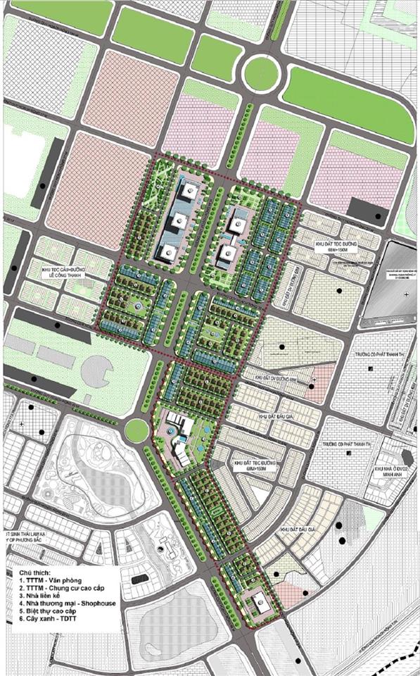 - Khu trung tâm thương mại - chung cư cao cấp: Chiều cao 15 - 20 tầng, khoảng 609 căn hộ cao cấp và 17775m2 sàn thương mại dịch vụ.
