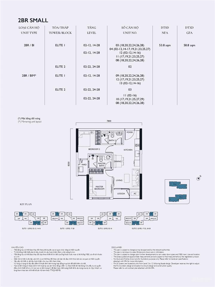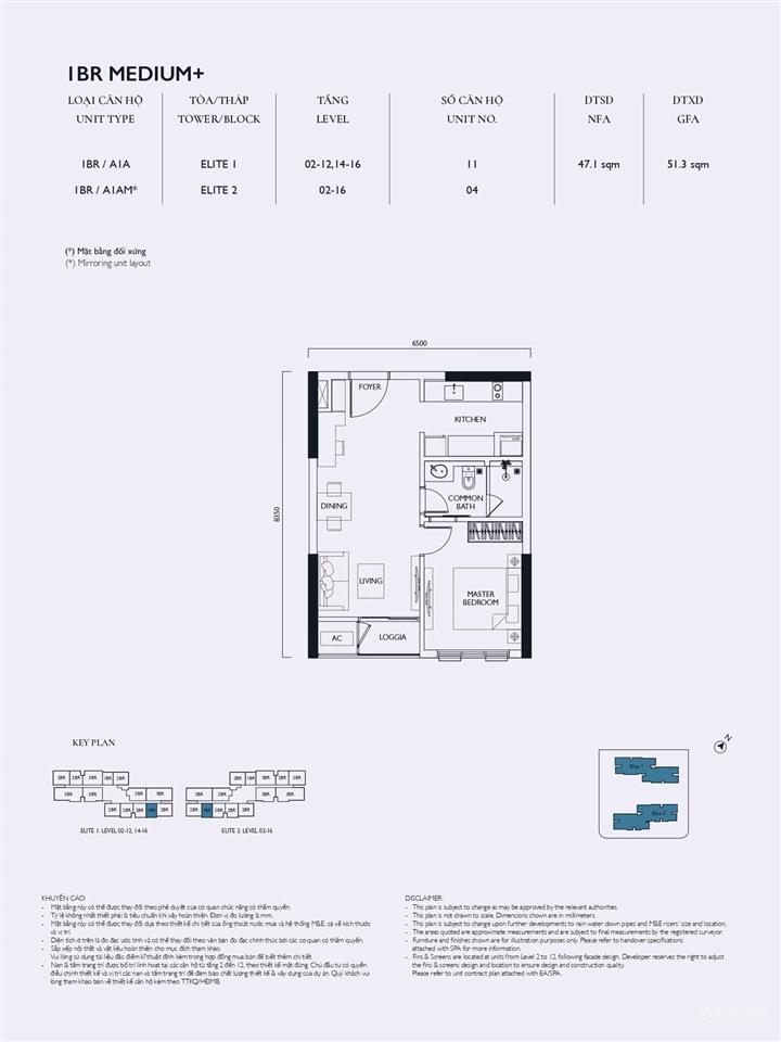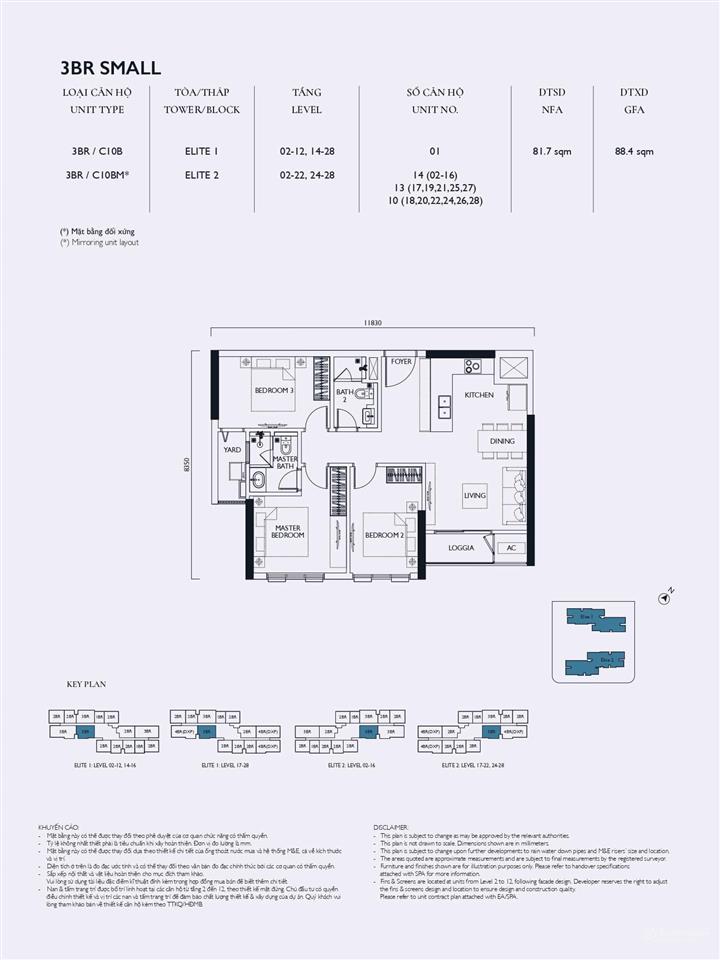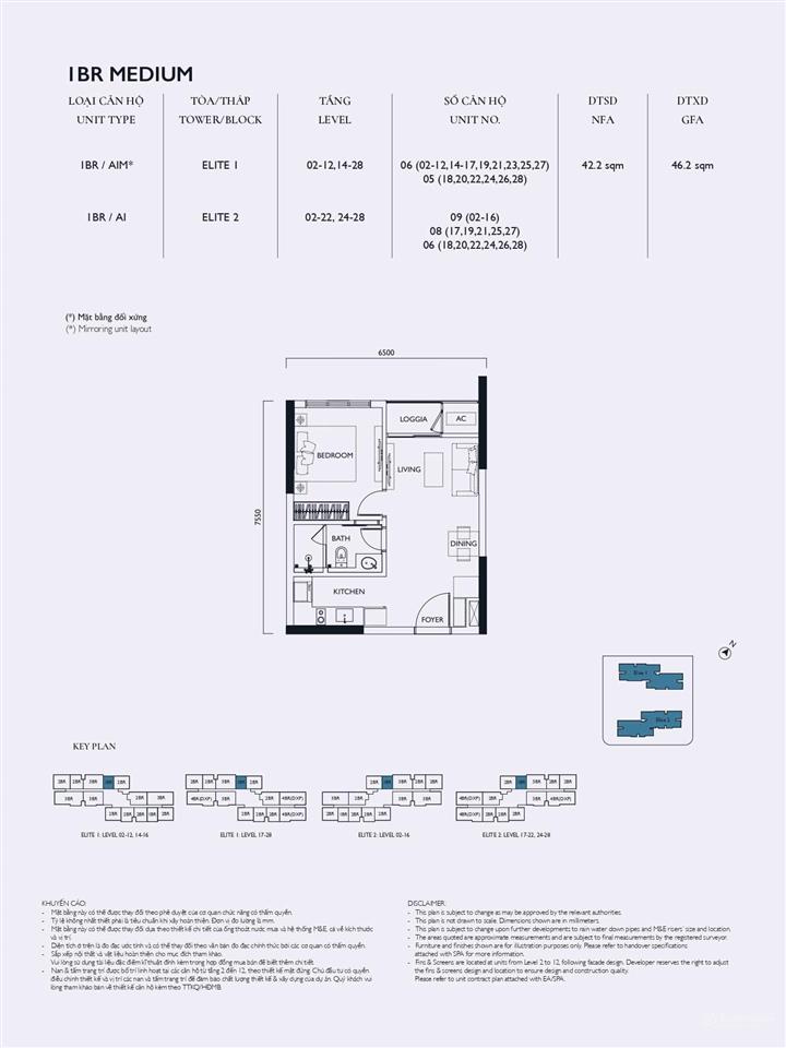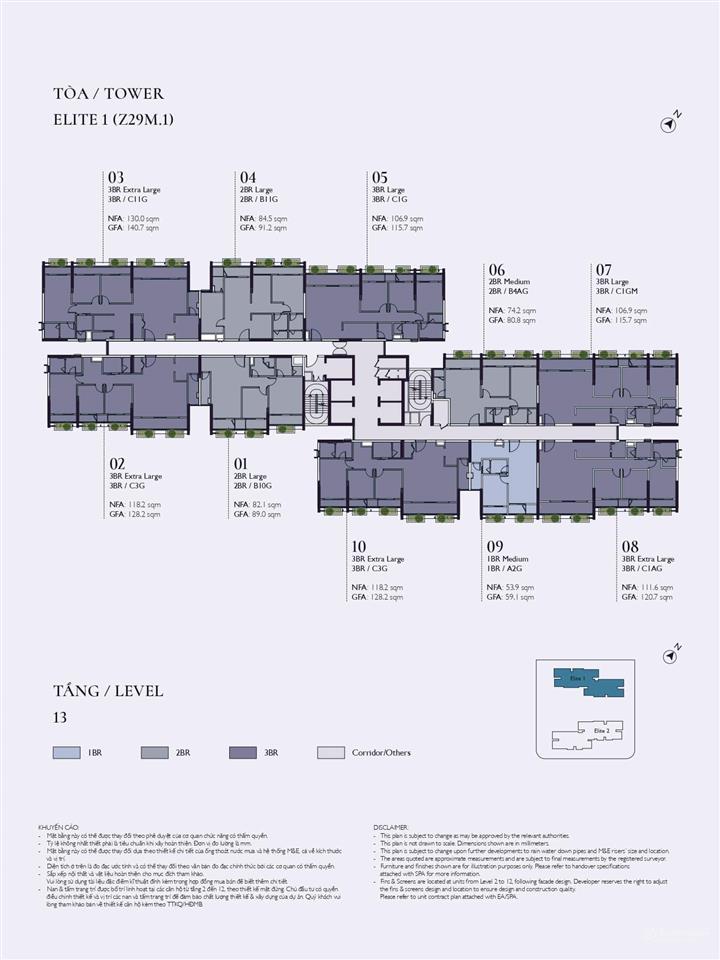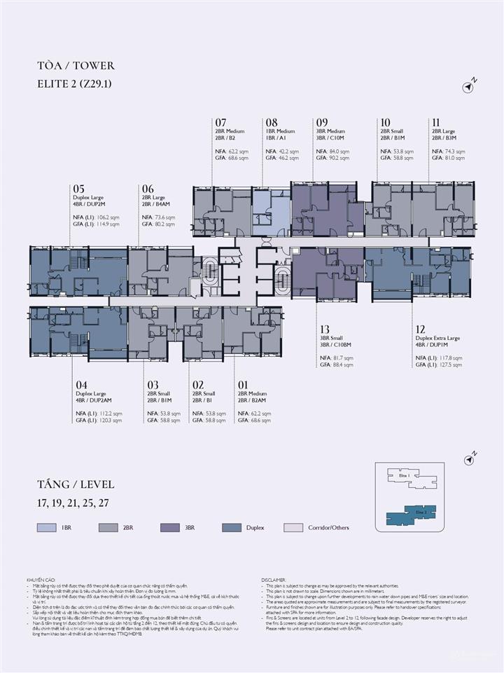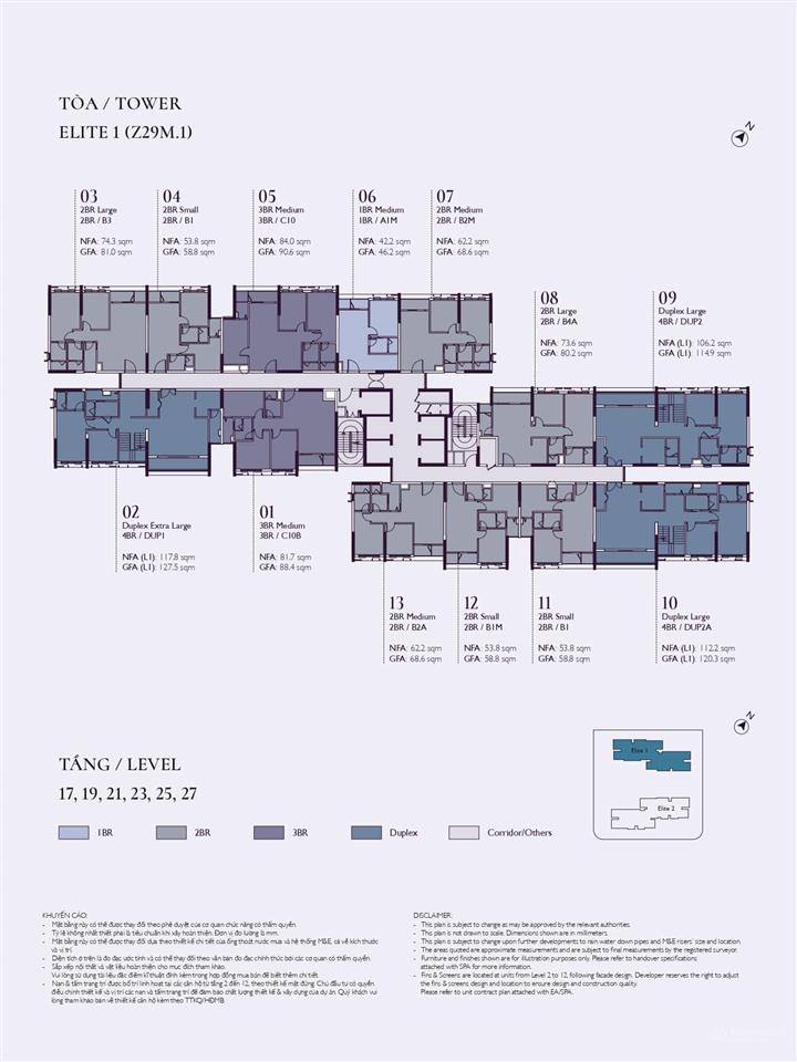 Tòa Elite 1: Tầng 20 có 13 căn/sàn, tầng 23 là căn hộ có vườn hoa với 12 căn/sàn.