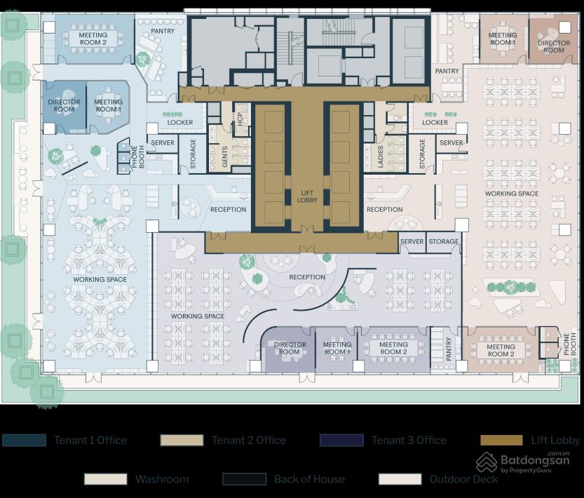 - Khu vực ngoài trời xanh: Thiết kế mở, dành cho khách thuê và khách tham quan tại tầng 1, các tầng bục từ tầng 5 đến tầng 9 và tầng thượng chỉ dành riêng cho khách thuê.