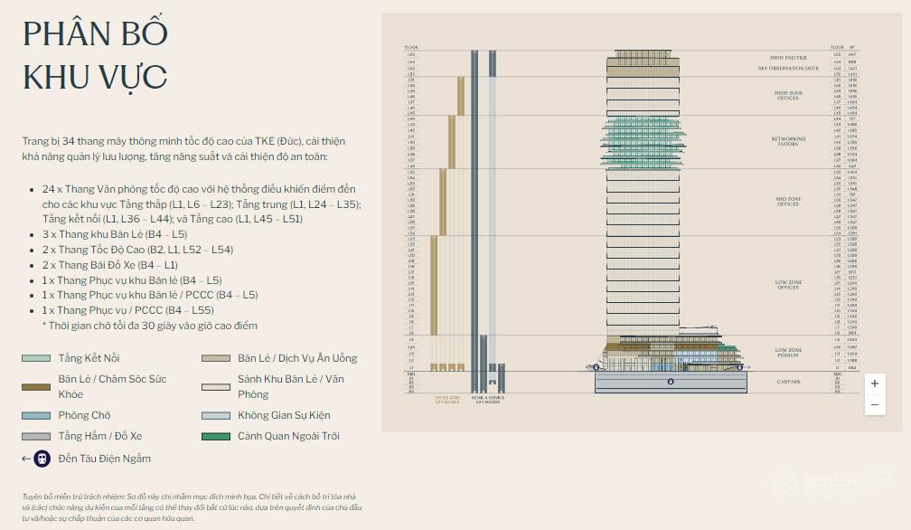 Diện tích sàn văn phòng cho thuê: Từ tầng 6 đến tầng 51, 5 tầng khối đế là không gian bán lẻ, 4 tầng trên cùng là không gian trải nghiệm ẩm thực cao cấp.