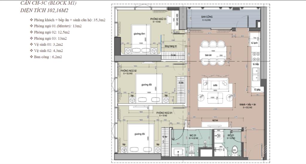 - Căn hộ 3 PN (660 căn): Diện tích 91.49m2 - 128.34m2