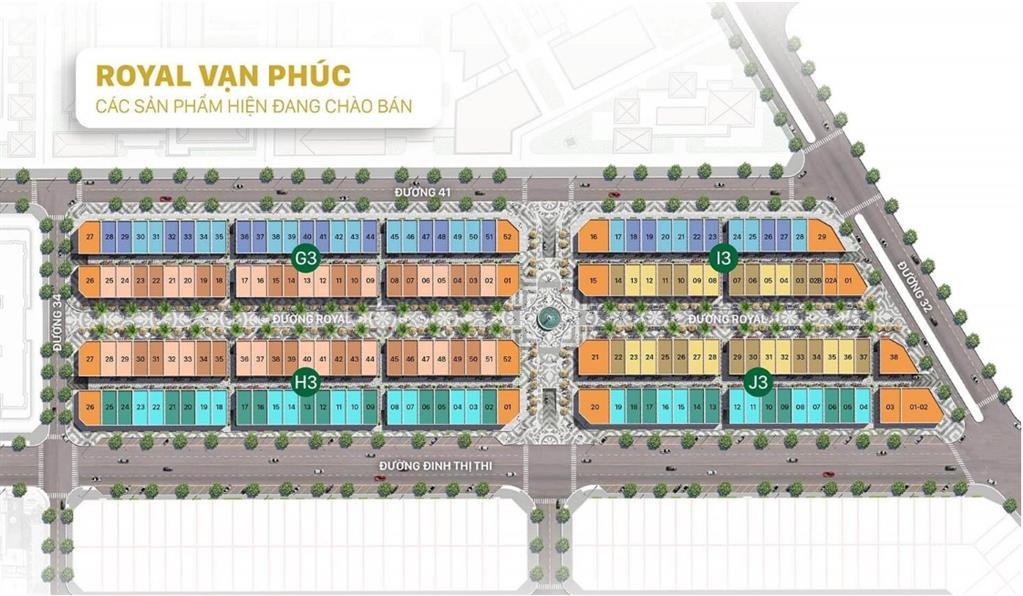 Phố thương mại Royal Vạn Phúc tọa lạc tại mặt tiền đường Đinh Thị Thi, 1 mặt tiếp giáp khu trường học, dọc theo tuyến đi bộ mua sắm Royal dài 400m. Dự án bao gồm các mã căn I3-J3-G3-H3 với thiết kế 5 tầng thương mại nằm ngay trên 3 tuyến đường trục chính Đinh Thị Thi 30m, tuyến phố đi bộ nhánh Royal 13m, và tuyến phố thương mại trung tâm đường số 41 20m.