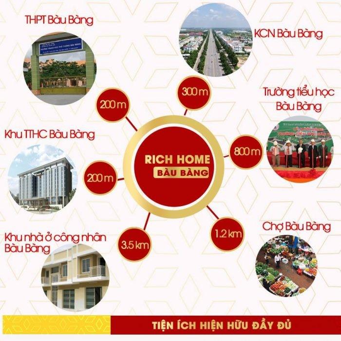 Rich Home Bàu Bàng nằm trong KCN đô thị Bàu Bàng và chỉ cách mặt đường QL 13 khoảng 200m, thuộc địa phận xã Lai Uyên, huyện Bàu Bàng, tỉnh Bình Dương.