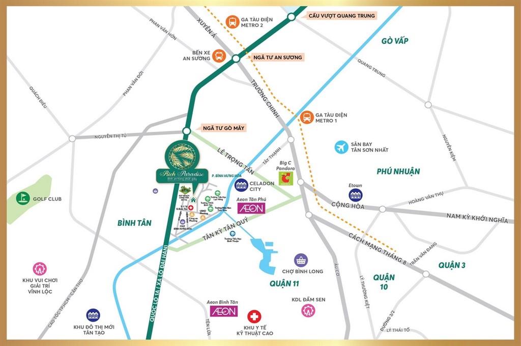Khu dân cư Rich Paradise nằm trên đường Tân Kỳ Tân Quý, phường Bình Hưng Hòa, Quận Bình Tân, Tp.HCM. Dự án nằm trong khu vực trung tâm hành chính của phường Bình Hưng Hòa. Dự án chỉ nằm cách Quốc lộ 1A khoảng 300m nên cư dân có thể dễ dàng di chuyển đến các khu vực lân cận cũng như vùng trung tâm thành phố.