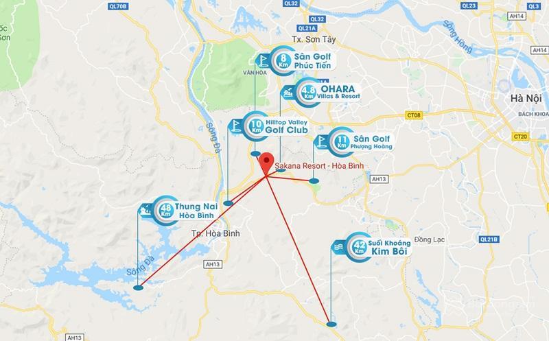 Dự án Sakana Spa & Resort Hòa Bình tọa lạc tại khu vực hồ Dụ, thuộc xã Mông Hóa, huyện Kì Sơn cũ, nay là TP. Hòa Bình (được sáp nhập từ năm 2020), tỉnh Hòa Bình. Đây được đánh giá là vị trí đắc địa, thừa hưởng cảnh quan thiên nhiên tươi đẹp, kết nối giao thông thuận lợi, gần nhiều điểm du lịch, giải trí khác của Hòa Bình.