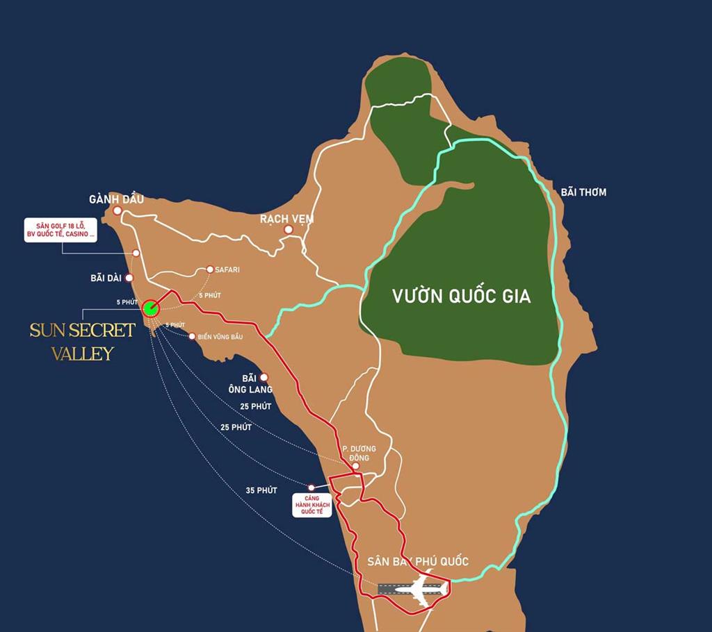 Khoảng cách từ vị trí dự án Sun Secret Valley Phú Quốc đến một số địa điểm, tiện ích nổi bật của khu vực như sau:
