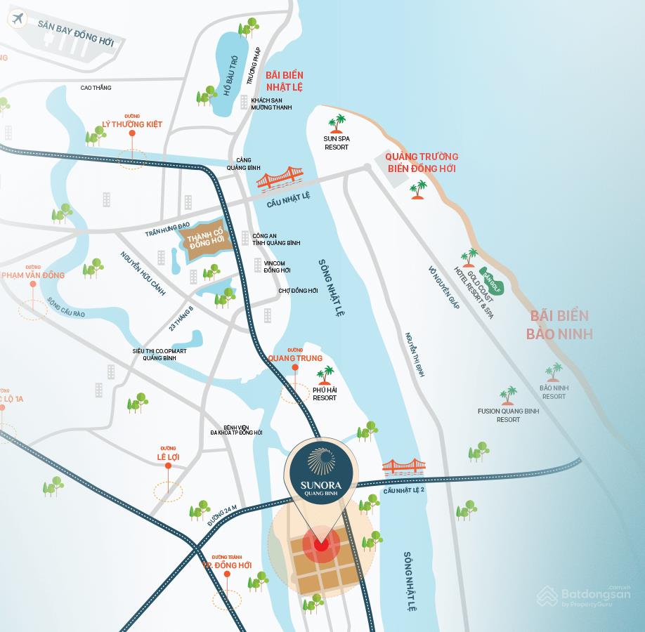 Dự án Sunora Quảng Bình sở hữu vị trí được đánh giá là chiến lược trên Đại lộ Quang Trung, thuộc phường Phú Hải, TP. Đồng Hới, tỉnh Quảng Bình. Vị trí dự án nằm giữa 2 con sông Lệ Kỳ và Nhật Lệ - biểu tượng tại TP Đồng Hới, vừa mang đến không khí mát mẻ, trong lành, vừa “đắc lộc vượng tài” theo quan niệm phong thủy.