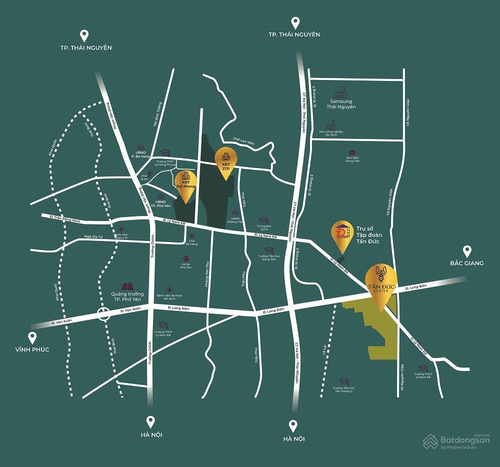 - Phía Bắc giáp với đường Trần Nguyên Hãn là trục Đại lộ Đông Tây kết nối Phổ Yên với Phú Bình và Bắc Giang, KCN Samsung