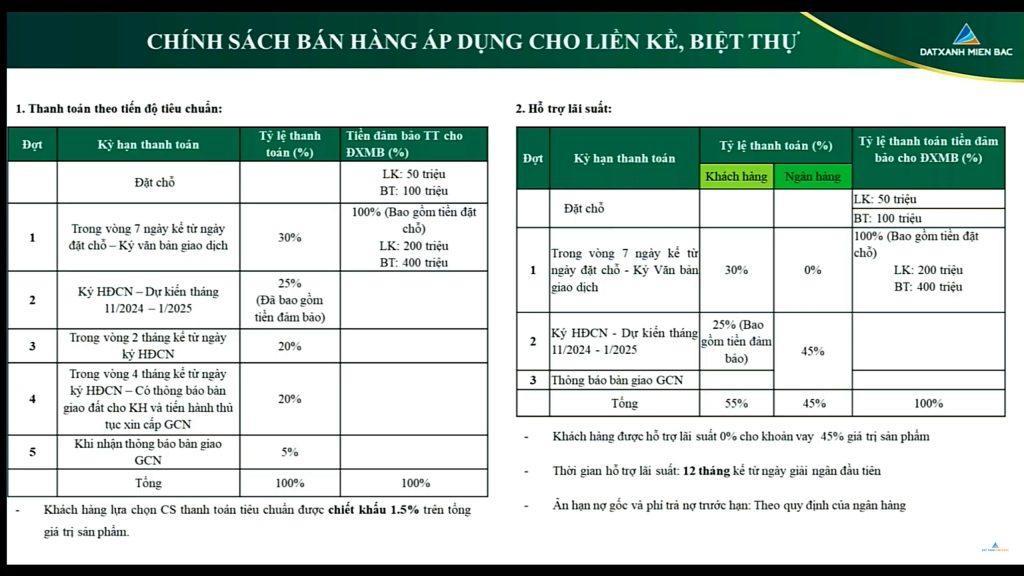 - Đối với Đất nền Liền kề, Đất nền Biệt thự: 5 đợt thanh toán trong 12 tháng đến 14 tháng.