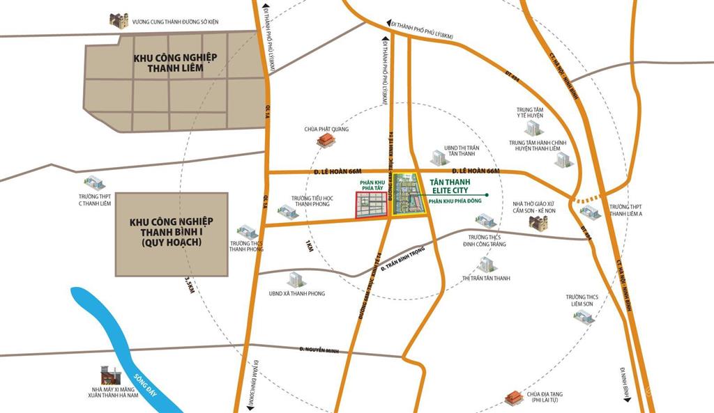 Dự án Tân Thanh Elite City chỉ cách Hà Nội khoảng 50 km, TP Phủ Lý 5 km, dễ dàng tiếp cận, sử dụng các tiện ích sẵn có trong khu vực như trường học, bệnh viện, các cơ quan hành chính, trung tâm thương mại.