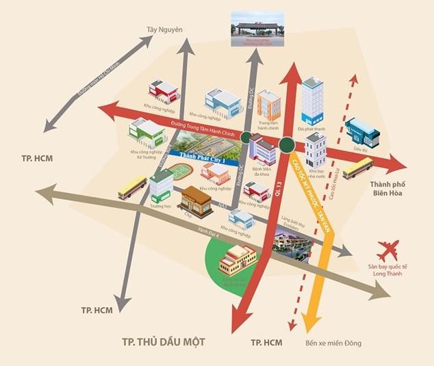 Dự án Thành Phát City 1 nằm trên tuyến đường xương sống Quốc lộ 13 và đường NC, tuyến đường chính của khu công nghiệp Bàu Bàng. Cư dân tại đây sẽ dễ dàng kết nối với các tuyến đường huyết mạch gần kề như đường vành đai 4, đường Hồ Chí Minh, cao tốc Mỹ Phước Tân Vạn, đường 30/4, đường DC nối liền khu công nghiệp Minh Hưng Chơn Thành.