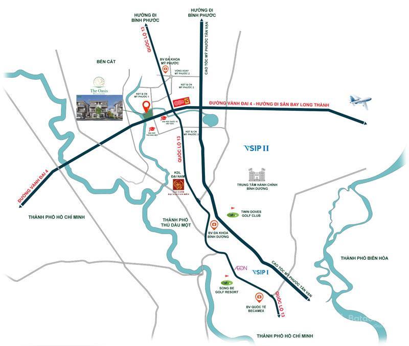 Vị trí dự án The Oasis Riverside được xem là vị trí “kim cương”, nổi bật nhất khu vực Bến Cát, Bình Dương. Từ dự án The Oasis Riverside Bến Cát, cư dân có thể dễ dàng kết nối với 5 tỉnh thành phía Nam, gồm: TP.HCM, Bình Dương, Đồng Nai, Bình Phước, Tây Ninh.