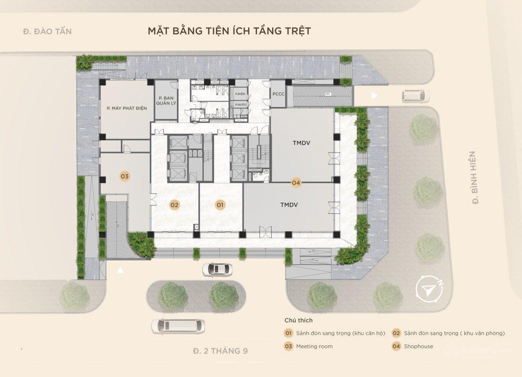- Tầng 1: 2 sảnh đón tiếp (sảnh văn phòng và sảnh căn hộ), nhà hàng, siêu thị mini, phòng meeting