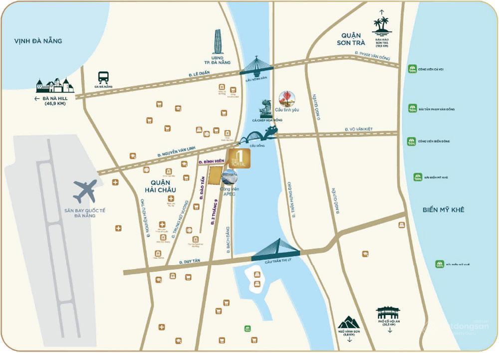 Dự án The One Tower Đà Nẵng sở hữu một trong những vị trí đẹp nhất ven bờ sông Hàn, với 3 mặt tiền đường 2/9, Bình Hiên và Đào Tấn, thuộc phường Bình Hiên, quận Hải Châu, TP. Đà Nẵng. Đây là khu vực sầm uất, nhộn nhịp nhất của thành phố biển, nơi tập trung nhiều công trình biểu tượng như cầu Rồng, công viên Apec, thường xuyên diễn ra nhiều sự kiện lớn như Lễ hội Pháo hoa Quốc tế, đua thuyền, hội hoa xuân...