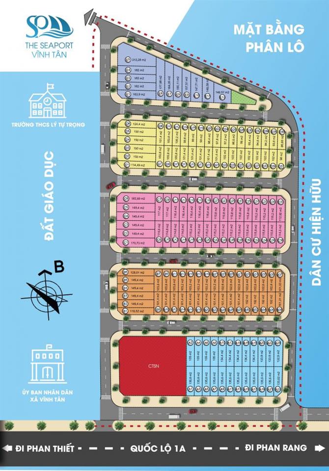 Dự án The Seaport Vĩnh Tân có tổng diện tích 3,9ha, trong đó gần một nửa là đất ở, chia làm 150 nền đất vuông vắn, diện tích dao động từ 100-150m2. Phần diện tích còn lại dành để làm đường giao thông, mảng xanh và tiện ích.