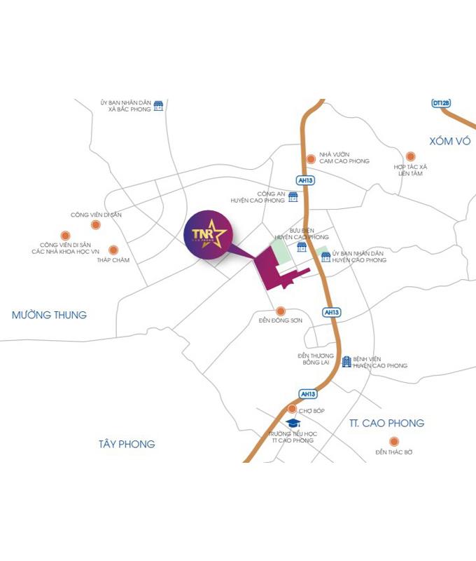 Khu đô thị TNR Stars Cao Phong được quy hoạch tại khu trung tâm thị trấn Cao Phong, huyện Cao Phong, tỉnh Hòa Bình, cách trung tâm TP. Hòa Bình khoảng 10km. Vị trí dự án TNR Stars Cao Phong nằm ngay cạnh Bưu điện và sân vận động huyện, gần nhiều điểm du lịch tâm linh, du lịch sinh thái nổi tiếng của địa phương. Bao quanh dự án là khu dân cư hiện hữu với hệ thống tiện ích hoàn chỉnh, có đầy đủ trường học, bệnh viện, trung tâm thương mại, các cơ quan hành chính,…
