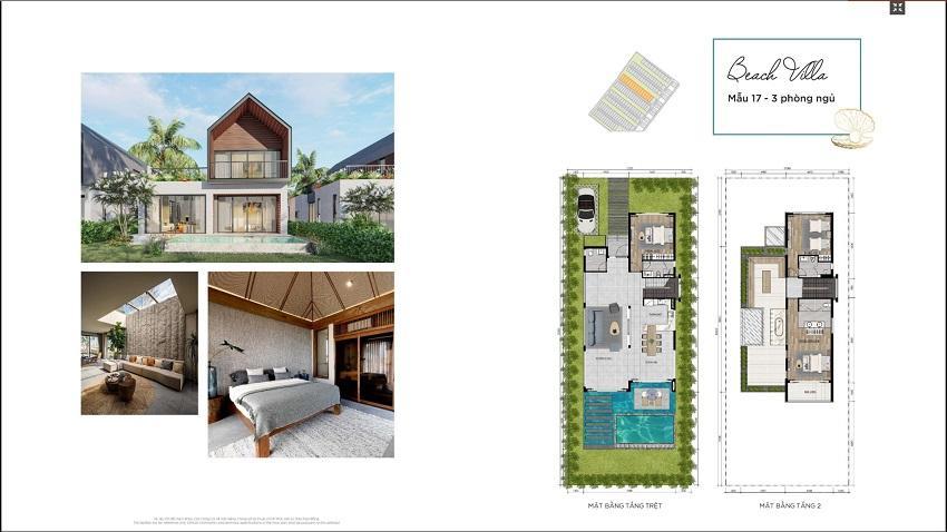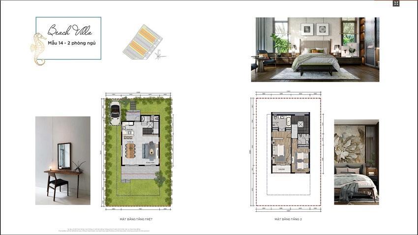 - Khu 1: Biệt thự mặt biển. Thiết kế đơn lập 1 trệt 1 lầu, 3-4 phòng ngủ, diện tích 12×20m, 15×20m, 16×25m