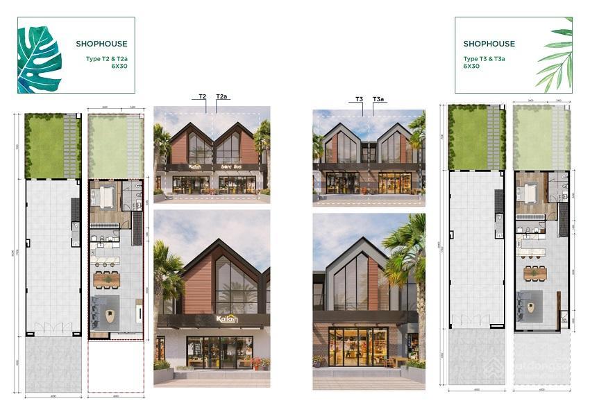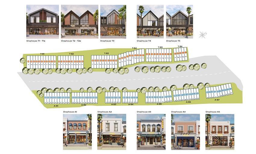 - Khu 2: Shophouse. Thiết kế 1 trệt 1 lầu. Bên phía biển thiết kế phong cách Mỹ (6×25 m2), bên phía đồi thiết kế phong cách nhiệt đới ( 6×30 m)