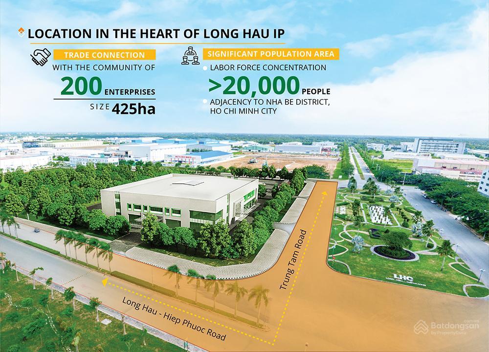Trung tâm Thương mại-Dịch vụ Long Hậu tọa lạc ở vị trí trung tâm KCN Long Hậu, ngay giao lộ trung tâm công viên, góc ngã tư đường Long Hậu và đường Trung Tâm. Đây được coi là vị trí chiến lược, tiếp giáp với cửa ngõ TP.HCM, thuận lợi cho lưu thông và vận chuyển hàng hóa từ các tỉnh, thành lân cận.