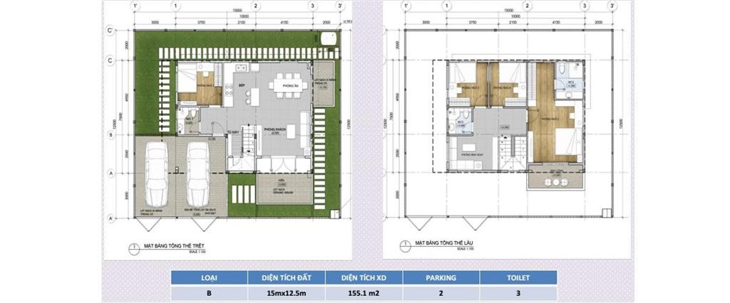 - LOẠI B: 39 căn, 155,1m2 (15m x 12,5m); gồm 4 phòng ngủ, 1 phòng khách và 3 WC.